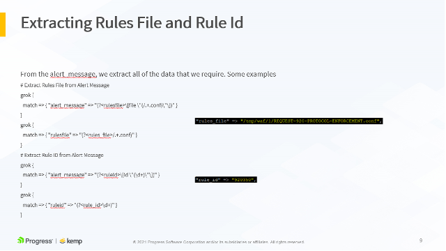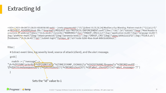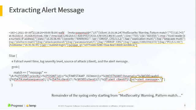 }The following slides show an example LoadMaster WAF syslog output and how it maps to the LogStash configuration above. This is further detailed in the accompanying video, available here.