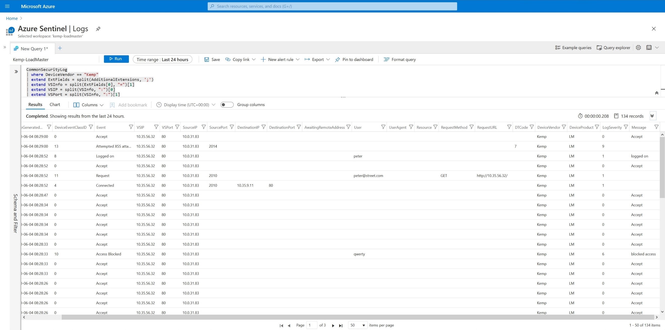 The Kusto language combined with the detailed information in the Kemp Technologies LoadMaster Edge Security Pack Common Event Format logs enables deep insight and visibility into authentication and authorization attempts in your network.