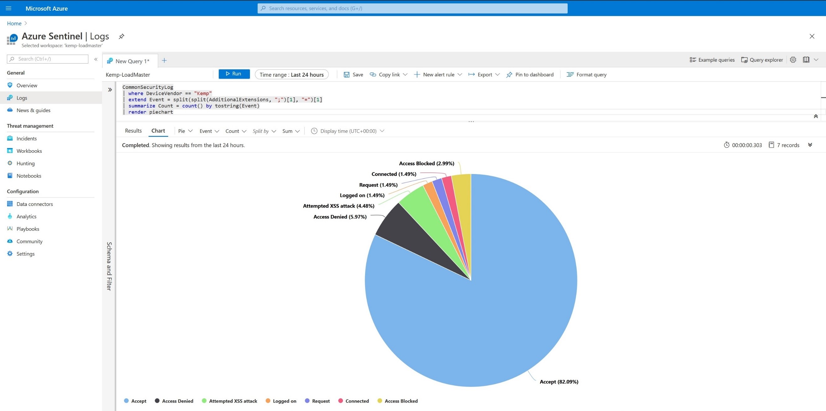 CommonSecurityLog | where DeviceVendor == “Kemp” | extend Event = split(split(AdditionalExtensions, “;”)[1], “=”)[1] | summarize Count = count() by tostring(Event) | render piechart