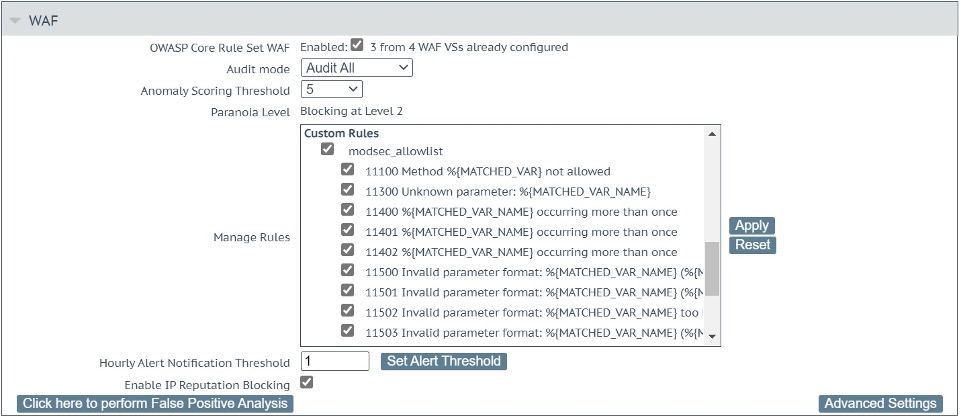 Nachdem Sie die Datei modsecurity_allowlist.conf importiert haben, navigieren Sie zu Virtual Services, View/Modify Services und wählen Sie den virtuellen Anwendungsdienst aus, für den diese benutzerdefinierte Regel verwendet werden soll. Nach der Auswahl navigieren Sie zu WAF. Aktivieren Sie das Kontrollkästchen, damit das Häkchen verfügbar ist, und klicken Sie auf die Schaltfläche "Anwenden".