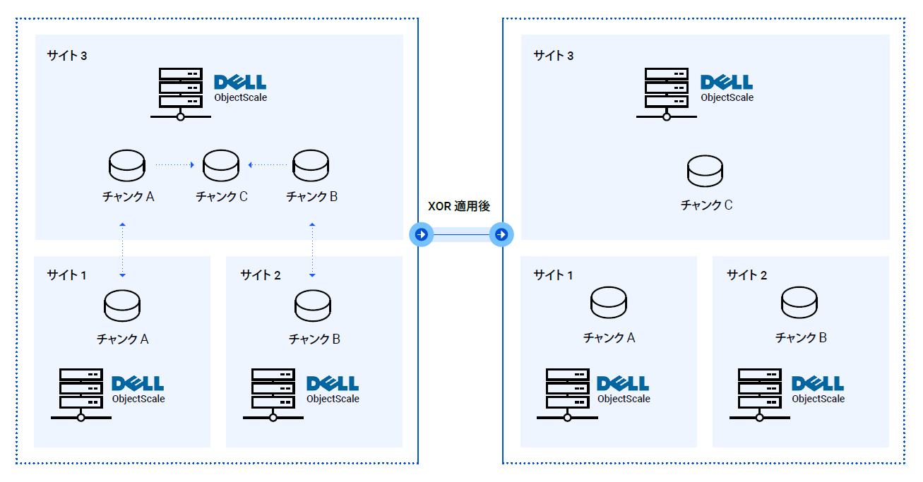 Dell ObjectScale には、XOR を使用してストレージ効率を向上させる機能があります。この機能を有効にするには、3つ以上 (最大8つ) の仮想データセンター (Virtual Data Center、VDC) またはサイトが必要で、これらの間でデータチャンクをレプリケートします。各 VDC 内では、複数のチャンクが1つのチャンクに統合されることで、ストレージ使用量を削減しつつ、サイト冗長性を確保します。ObjectScale ソリューションにおける XOR を活用した負荷分散コンポーネントは、高度な配信機能のために非常に重要です。