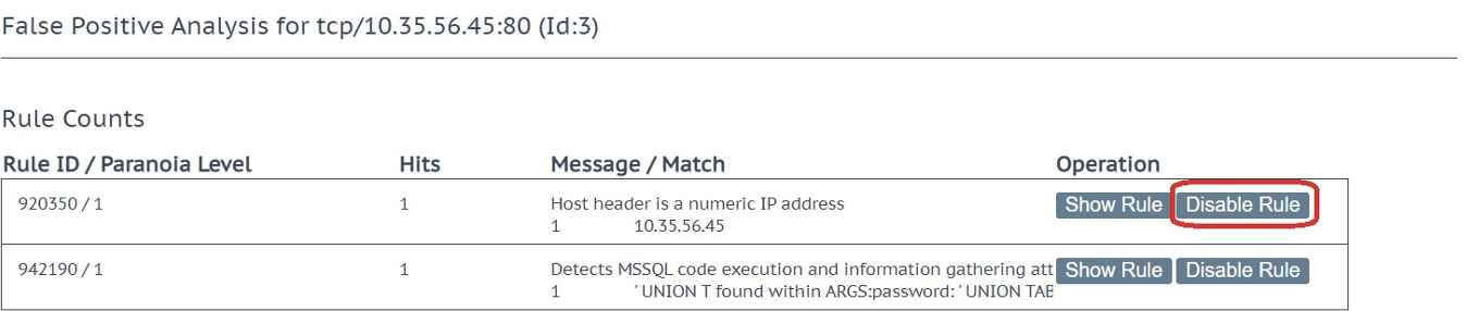 Wenn also eine Anforderung eine Anomaliebewertung von 15 Punkten angesammelt hat, werden die drei Regeln, aus denen sich diese 15 Punkte zusammensetzen, daneben angezeigt. Unsere Anfrage löste 8 Punkte aus, wenn Sie die WAF über ihre IP-Adresse des virtuellen Dienstes aufgerufen haben (Testmethode 1) oder 5 Punkte, wenn Sie einen Hostnamen verwendet haben (Testmethode 2). Sie können sie deaktivieren, indem Sie auf "Regel deaktivieren" klicken, wie in Abbildung 5 dargestellt.