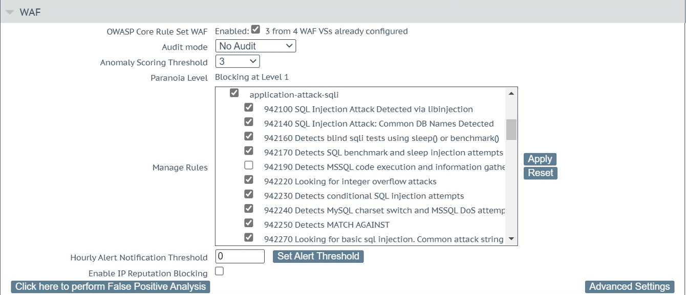 Navigieren Sie in der WAF-Konfiguration des virtuellen Dienstes zum Abschnitt Regeln verwalten (Virtuelle Dienste – Dienste anzeigen/ändern, wählen Sie den zu testenden virtuellen Dienst aus). Dort klicken Sie auf den Namen der richtigen Regelgruppe/Kategorie, um die vollständige Liste der Regeln pro Gruppe zu erhalten. 942190 ist Teil der Gruppe "application-attack-SQL". Alle Regeln im Bereich 942xxx werden angezeigt, scrollen Sie nach unten, deaktivieren Sie das Häkchen vor der 942191 Regel-ID und klicken Sie auf die Schaltfläche "Anwenden", wie in Abbildung 3 dargestellt.