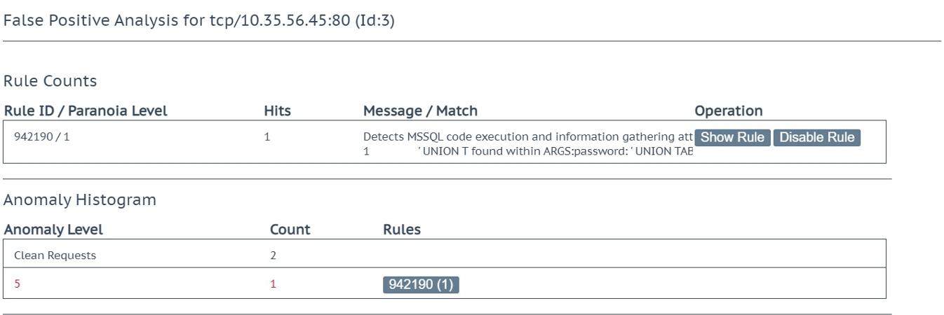 Der zweite Ansatz zum Deaktivieren einer Regel besteht darin, zu Web Application Firewall – False Positive-Analyse für diesen virtuellen Dienst zu navigieren. Dadurch wird eine Ansicht geöffnet, in der Sie aktuelle Regelwarnungen überprüfen können. Es gibt einen Zähler für die einzelnen Regelwarnungen, die 942190 enthalten. Es gibt auch eine Liste der deaktivierten Regeln und dann ein Histogramm, das nach der Anomaliebewertung der Anforderungen organisiert ist, wie in Abbildung 5 dargestellt.