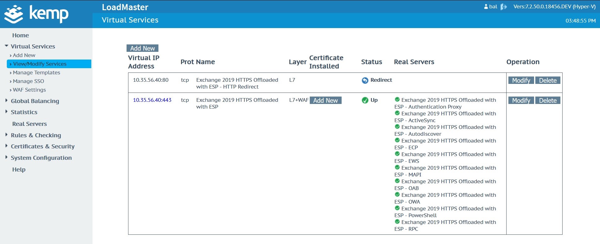 Once the custom WAF rule is uploaded and available, navigate to the Microsoft Exchange Virtual Service. In this case, the Microsoft Exchange Virtual Service was created with a Kemp Technologies Exchange 2019 template.
