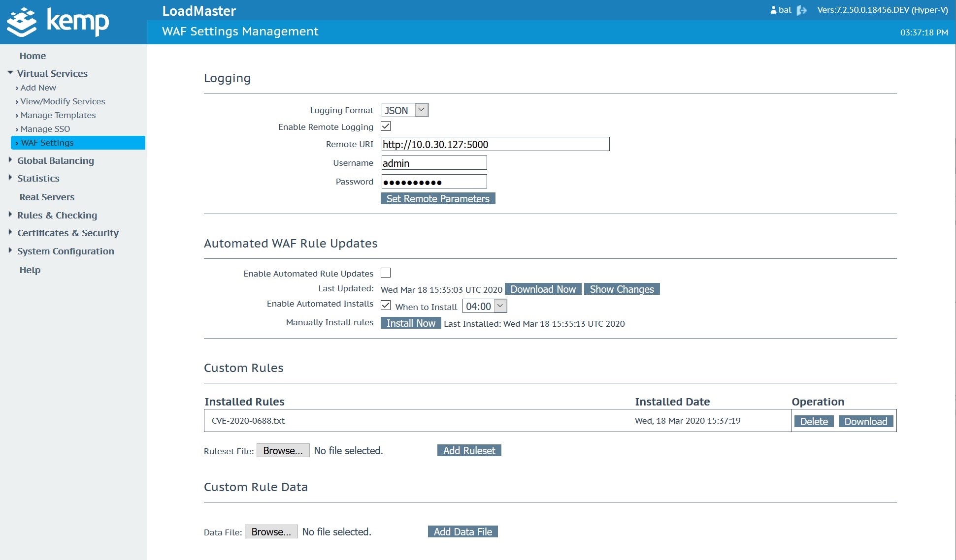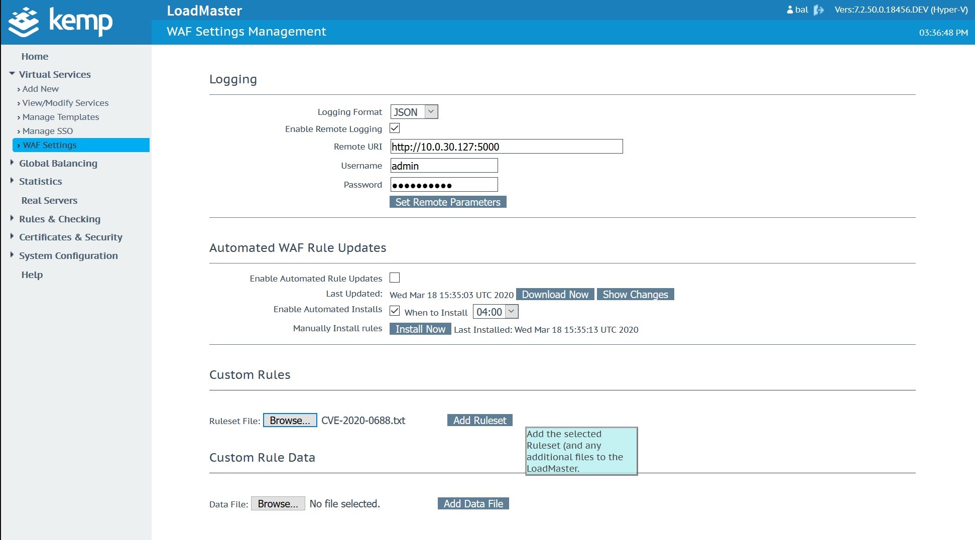 This is added to a text file and uploaded to the Kemp Technologies WAF as shown: