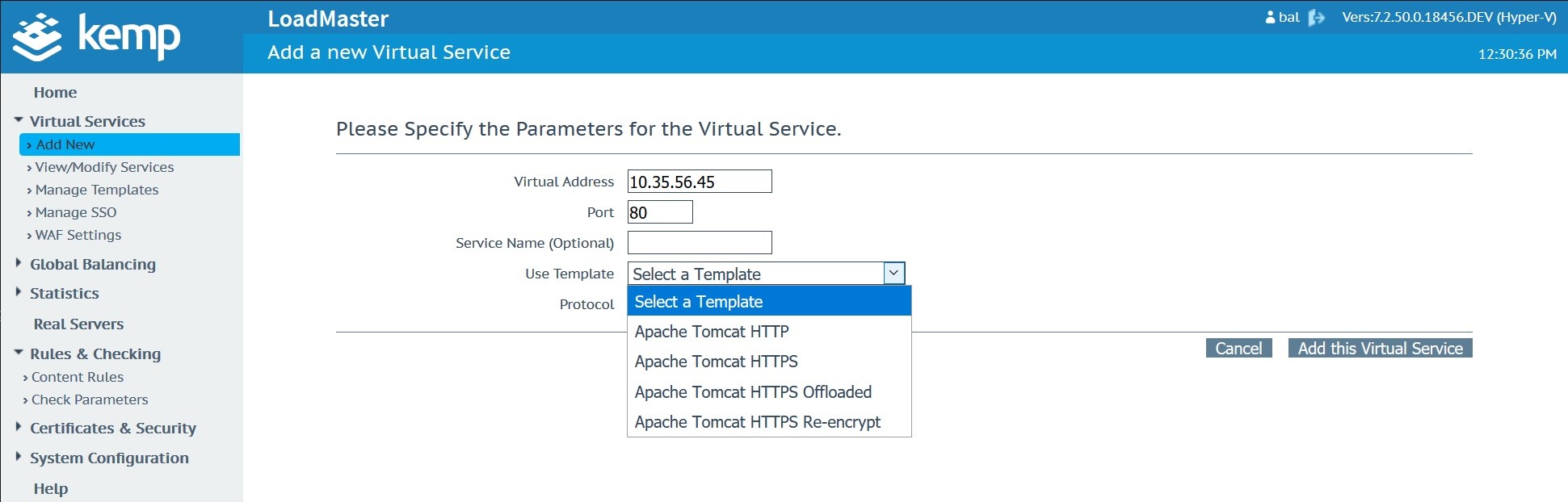 Download the Kemp Apache template hereImport the template into your Kemp in the “Manage Templates” menu located under “Virtual Services”.