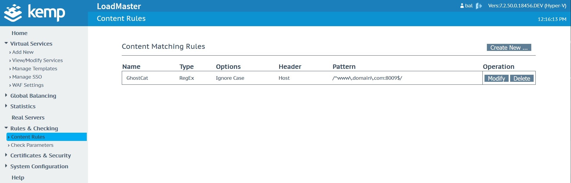 Create a new “GhostCat” rule in the Content Rules menu which you’ll find under “Rules & Checking”. This will need to be a “Content Matching” rule type using the “Regular Expression” match type against the “Host” header field. Use the “Match String” shown in the below screenshot which is basically looking for any attempts to connect to the service it gets applied to on port 8009.