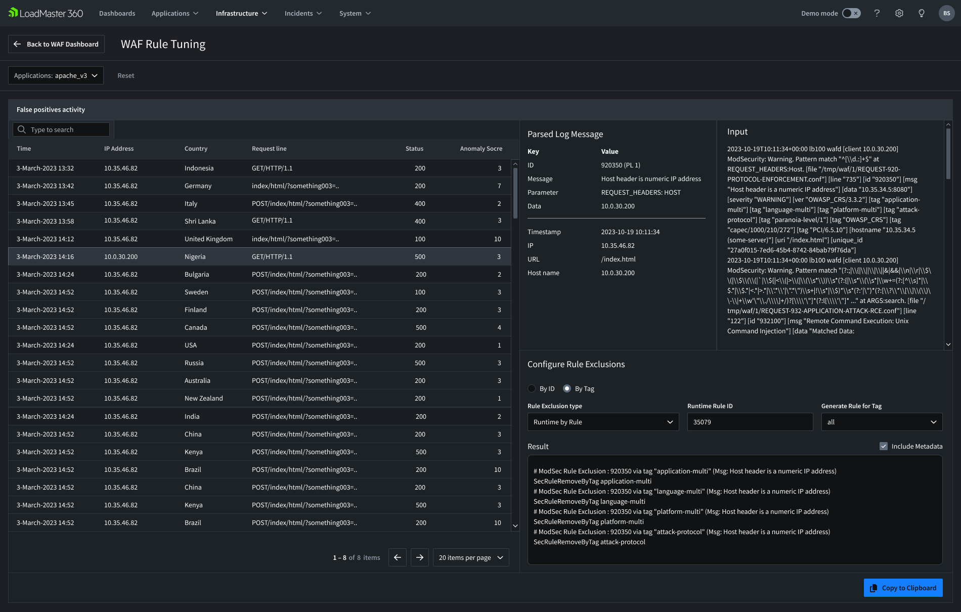 The WAF Tuning features let you view individual false positive events, view the activity from intelligently parsed logs and configure rule exclusions to properly tune your ruleset to only allow legitimate traffic. These smart capabilities will help you minimize false positive responses and quickly reach a more secure stance.