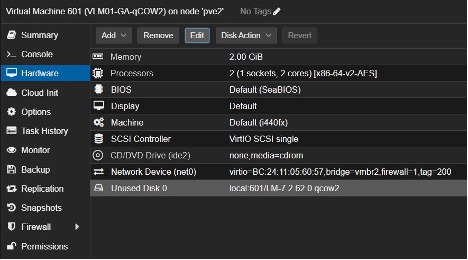 5. Zurück zur Proxmox WUI: Navigieren Sie zum „Hardware“-Tab der VM. Die Festplatte wird nun angezeigt, ist jedoch noch nicht aktiv. Wählen Sie die ungenutzte Festplatte aus und klicken Sie auf „Bearbeiten“.