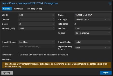 Hinweis: Default Storage: Ziel-Speicherort der VM. Importing Working Storage: Speicherort, der für die Verarbeitung der OVA-Datei während des Imports verwendet wird. Wichtig: Für das Importing Working Storage muss ein File-basiertes Storage verwendet werden.