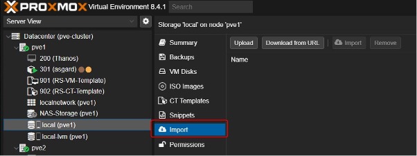 Jetzt muss die Festplatte in einen Storage-Typ importiert werden, der virtuelle Maschinen unterstützt: zum Beispiel „local-lvm“.