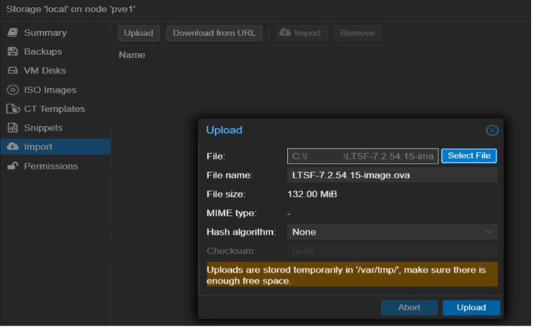 1. Upload starten: Klicken Sie im Proxmox-Webinterface auf die Schaltfläche „Upload“ und wählen Sie den Speicherort Ihrer OVA-Datei aus.
