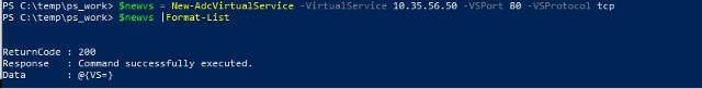 To create a new Virtual Service with IP 10.35.56.50, I use the New-AdcVirtualService command as shown in Figure 1.