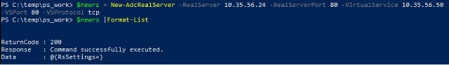 To assign a Real Server with IP 10.35.56.24 to this Virtual Service with IP 10.35.56.50, I use the New-AdcRealServercommand as shown in Figure 2.