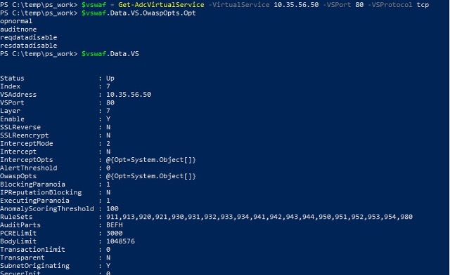 Now that I have WAF enabled on the Virtual Service, I will outline all the PowerShell API parameters that are available. To check the current settings of the PowerShell API parameters, I will use the Get-AdcVirtualService command as shown in Figure 5.