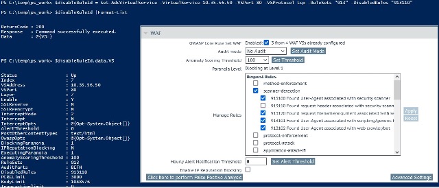 Multiple Rule Sets with multiple rules can be disabled in a single Set-AdcVirtualService command. For example, with the parameters -RuleSets “913,920” -DisabledRules “913120,913110,920160,920171”.