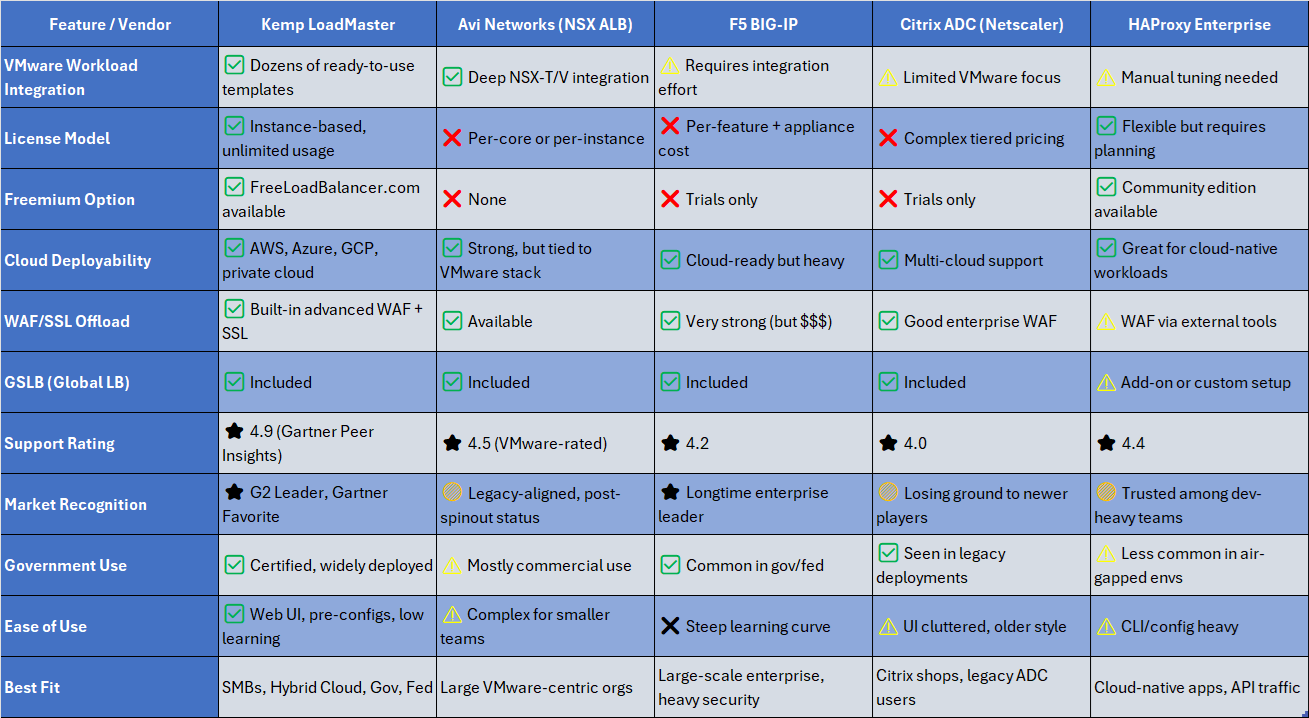 Matrice de comparaison : Kemp LoadMaster vs Avi vs autres principaux équilibreurs de charge