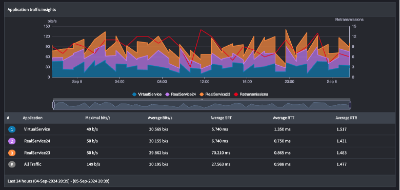 Similarly, tracking performance metrics such as Round Trip Time (RTT) and Server Response Time (SRT) can identify latency in the application delivery chain. Since each application is mapped to specific virtual services, you can identify bottlenecks in the delivery chain and analyze how each virtual service impacts the overall application experience.