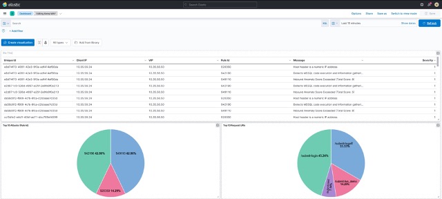 LogStash has parsed the LoadMaster WAF syslog messages and we can see that it has extracted the Client IP, Virtual Service IP, ModSecurity message / severity / unique IP / attack type etc. fields. With this information available, we can use Kibana to build visualizations as shown in Figure 9.