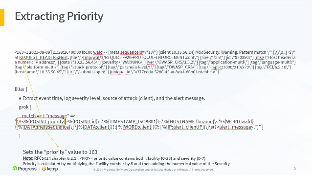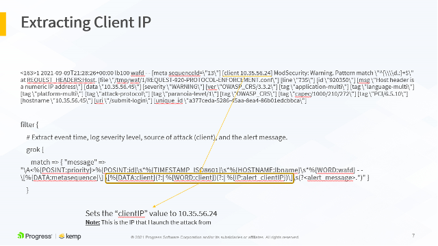 }The following slides show an example LoadMaster WAF syslog output and how it maps to the LogStash configuration above. This is further detailed in the accompanying video, available here.