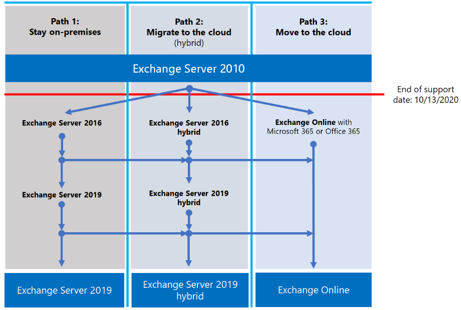 Viele Kunden verwenden noch eine ältere Version von Exchange Server, z. B. Exchange 2010 und Exchange 2013. Obwohl dies immer noch gut funktioniert, wird Microsoft den Support für Exchange 2010 am 13. Oktober 2020 einstellen. Das sind nur noch drei Monate des Schreibens. Das Produkt wird am 13. Oktober 2020 nicht aufhören zu funktionieren, aber Microsoft wird es nicht mehr unterstützen und was noch wichtiger ist, Sicherheits-Hotfixes werden nicht mehr veröffentlicht. Letzteres ist ein starkes Argument für ein Upgrade Ihrer Exchange 2010-Umgebung.