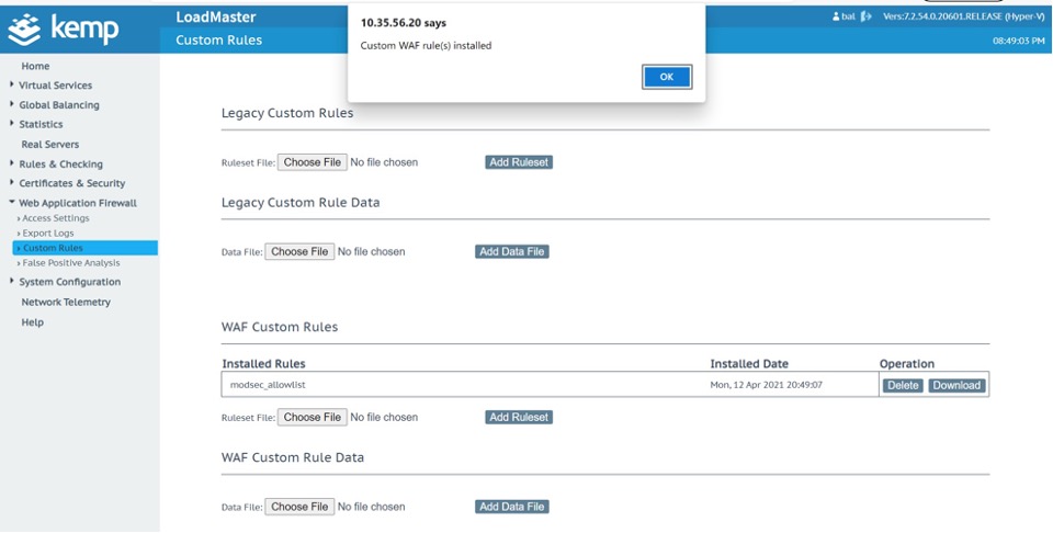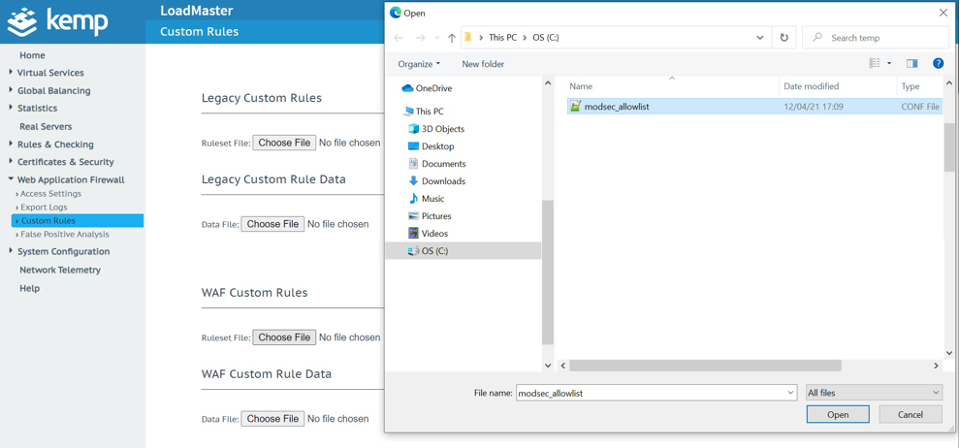 Importieren Sie die modsecurity_allowlist.conf in den LoadMaster in der Web Application Firewall, die sich in der linken Navigation befindet, klicken Sie auf Benutzerdefinierte Regeln und wählen Sie "Datei auswählen", um die benutzerdefinierte Regeldatei unter dem Titel WAF Benutzerdefinierte Regeln auszuwählen.
