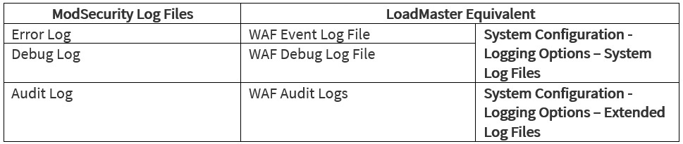 Die LoadMaster-Protokolle werden in die ModSecurity-Protokolle gespiegelt und die Zuordnung lautet: