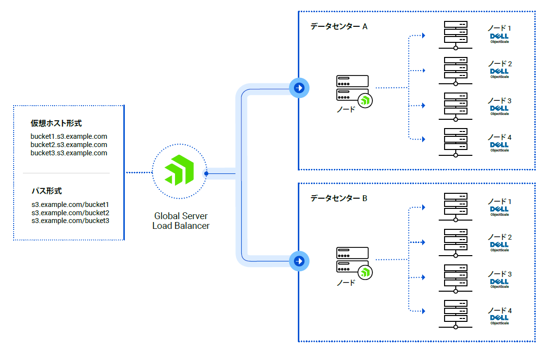 オブジェクトストレージソリューションにはレジリエンスが必要であり、多くの場合、ObjectScale を複数の地理的に異なる場所にデプロイします。LoadMaster の Global Server Load Balancing (GSLB) は、インテリジェントな DNS を使用して、これらの複数の場所にトラフィックを分散します。GSLB の実装は、ストレージにアクセスするアプリケーションが、パス形式のアドレス指定方法を使用するか、仮想ホスト形式のアドレス指定方法を利用するかによって異なります。これは、HTTP ホストヘッダー内に S3 バケット名が含まれるようになった仮想ホスト形式の動作によるもので、DNS がこの動的アドレス指定方法をサポートする必要があります。LoadMaster はこの要件を満たし、GSLB 内で動的グローバルホスト解決をサポートするように拡張して、パス形式と仮想ホスト形式の両方のアドレス指定方法を利用する ObjectScale 展開に柔軟なマルチサイト分散と可用性を提供します。