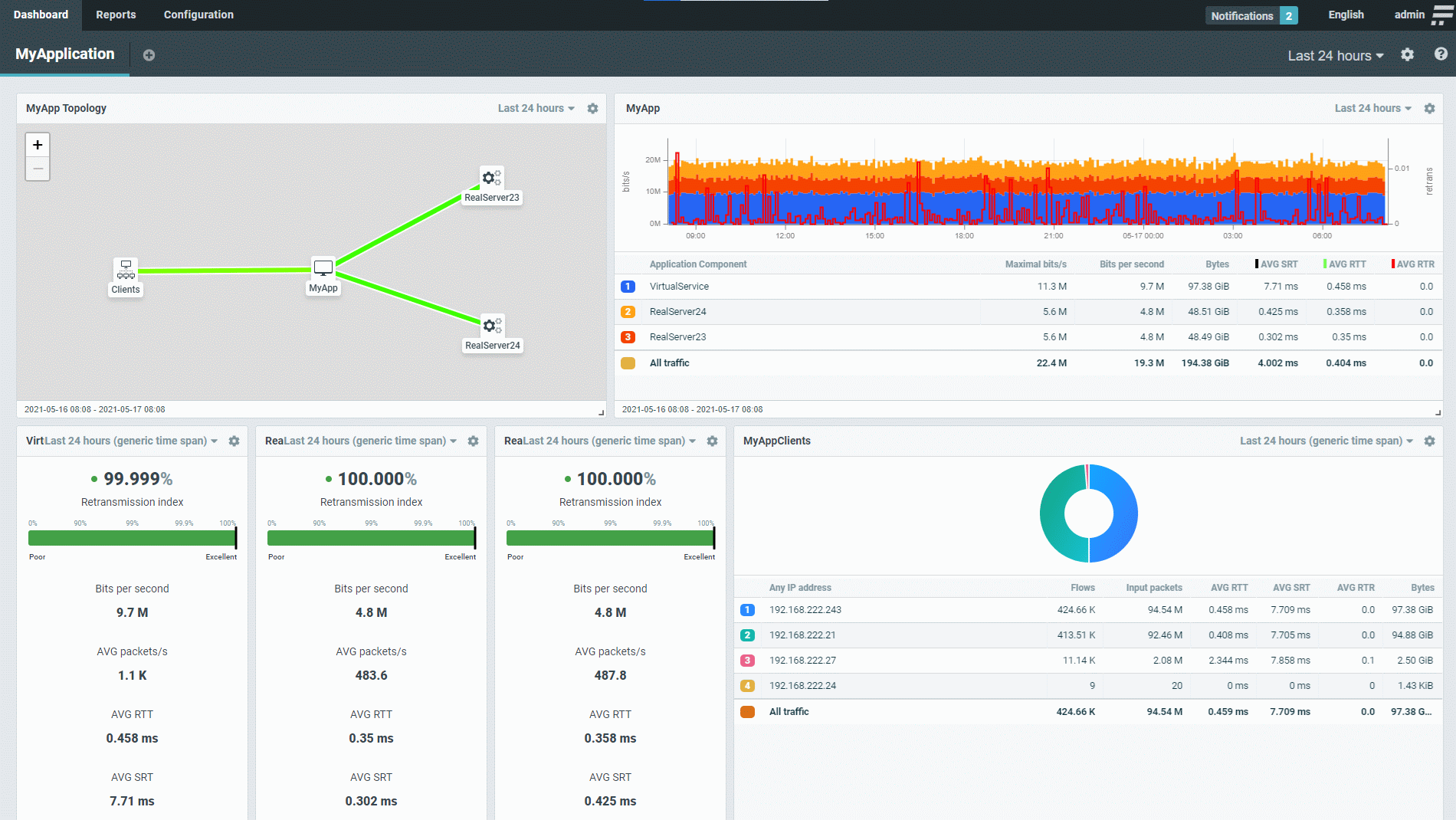 Auf dem Flowmon Collector können Sie ein umfassendes Dashboard erstellen, das die wichtigsten Kennzahlen Ihrer Anwendung anzeigt. Diese werden auf Grundlage der vom LoadMaster bereitgestellten Netzwerktelemetrie ermittelt.