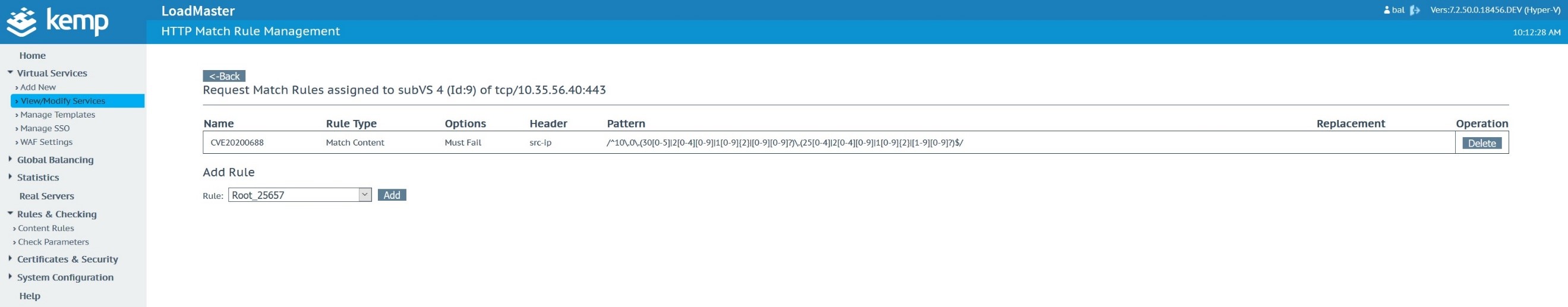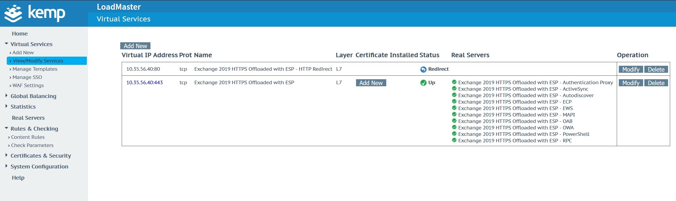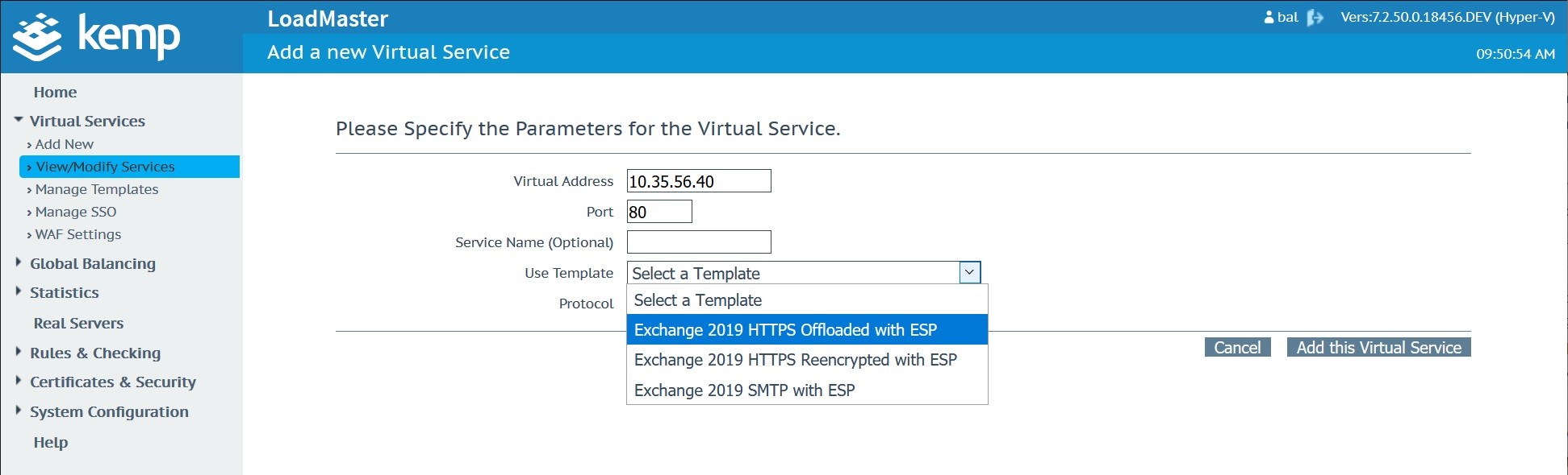 Once the custom WAF rule is uploaded and available, navigate to the Microsoft Exchange Virtual Service. In this case, the Microsoft Exchange Virtual Service was created with a Kemp Technologies Exchange 2019 template.
