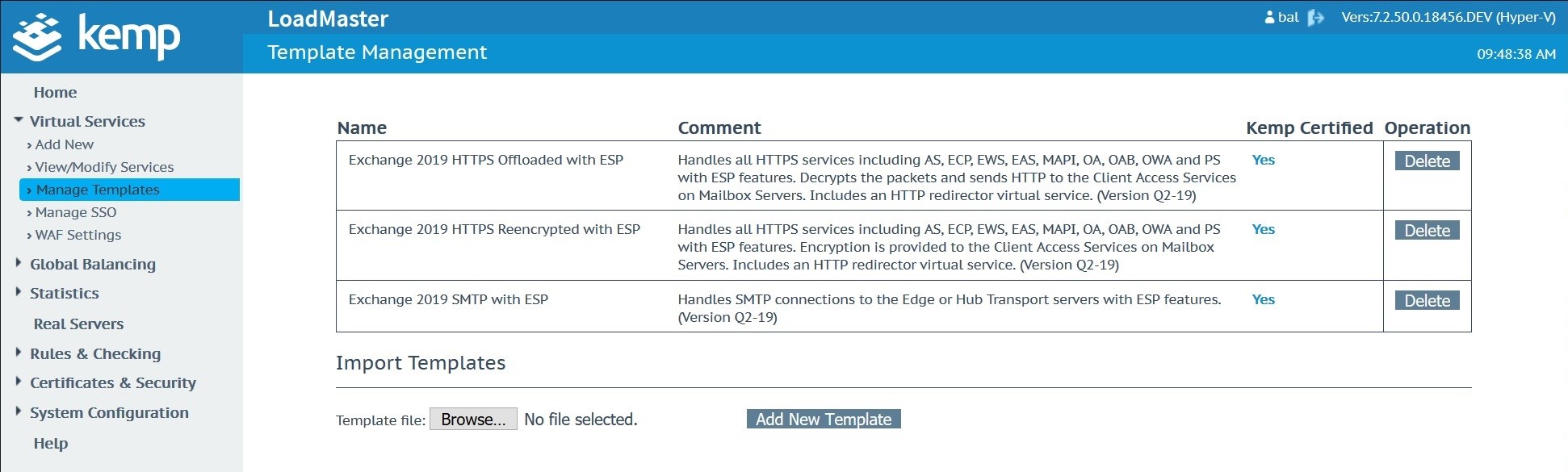 Import the template into your Kemp in the Manage Templates menu located under Virtual Services
