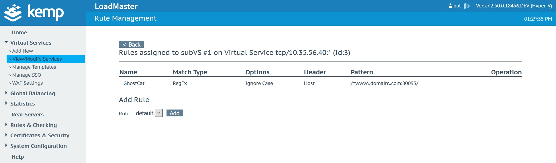 Create a new “GhostCat” rule in the Content Rules menu which you’ll find under “Rules & Checking”. This will need to be a “Content Matching” rule type using the “Regular Expression” match type against the “Host” header field. Use the “Match String” shown in the below screenshot which is basically looking for any attempts to connect to the service it gets applied to on port 8009.