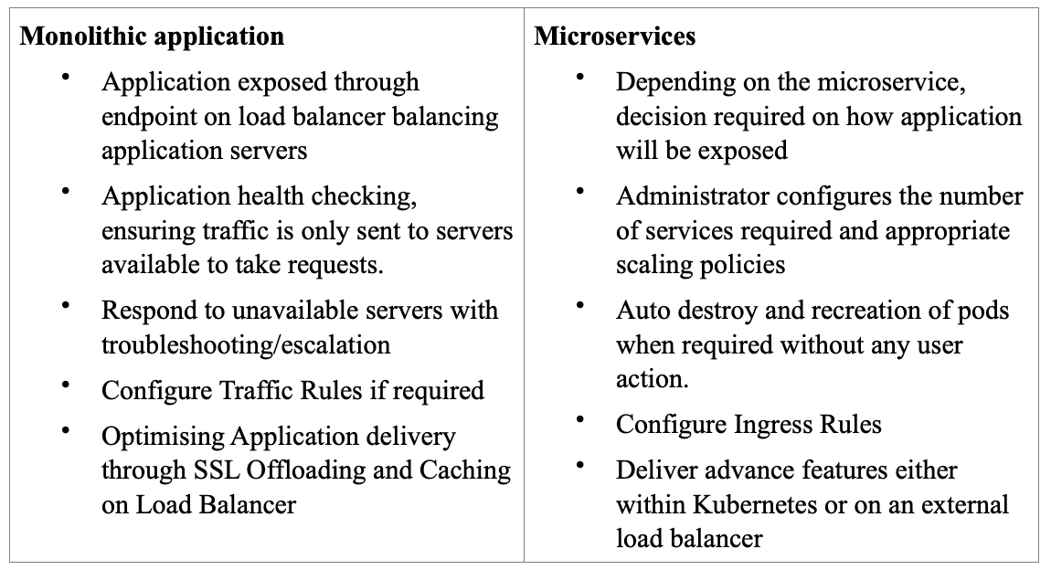 The changes outlined bring their own challenges to the job involved in ensuring applications can be accessed all the time by all users. For the traditional monolithic application it is typical for a network administrator to be responsible for exposing an application through an end point typically configured on a Load Balancer for application redundancy. Along with this, intelligent health checking is done to ensure traffic is only sent to servers available to take requests. When servers are unavailable, redundancy ensures application availability is maintained (at least with overall loss of capacity) and troubleshooting/escalation is triggered to ensure overall availability is maintained. Applications can be optimized through SSL Offloading and Caching typically performed by a Load Balancer/Application Delivery Controller. Finally content rules/policies may be configured so certain traffic is sent to a specific server typically based on path, hostname or device.