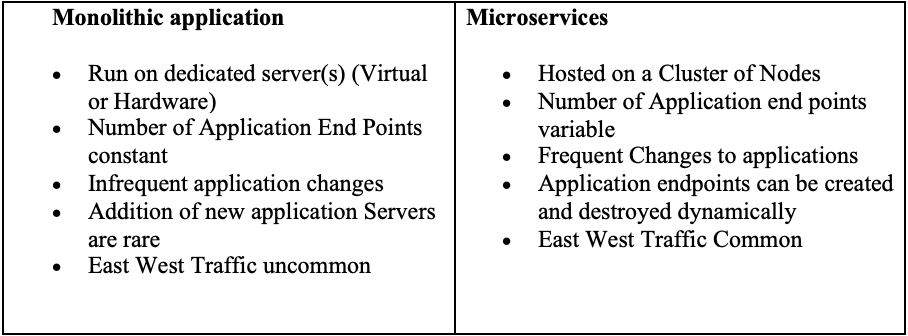 In the traditional (monolithic) Infrastructure, applications run on distinct servers (Virtual, Cloud or Hardware) and application end points are typically the servers themselves. (Or at least delivered via a unique port number on a server). As a result of this, the number of application end points is relatively constant. Upgrades and changes to these are not too frequent and come with some administrative cost such as maintenance windows and/or loss of redundancy. Additional server end points are added (perhaps as demand scales) though isn’t a frequent occurrence. On top of this since applications are self-contained most traffic handled is from clients to the application (commonly referred to as North-South traffic) and there is less application to application traffic (East-West traffic) across the network.