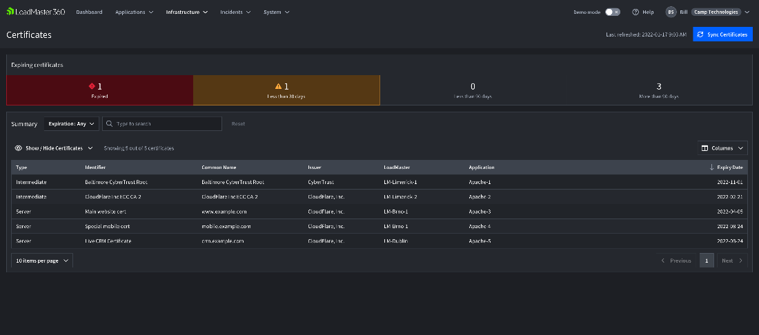 The latest cybersecurity best practice advice is pressuring the market to use certificates with shorter expiration windows spanning months rather than years. This means that certificates need to be updated more often, and there is an increased risk that an update for one will be missed. LoadMaster 360 currently allows users to observe all certificates and alerts them to upcoming expiration dates.
