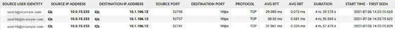 The table of flows is replaced with one that includes the source user identity associated with each flow, as in this example: