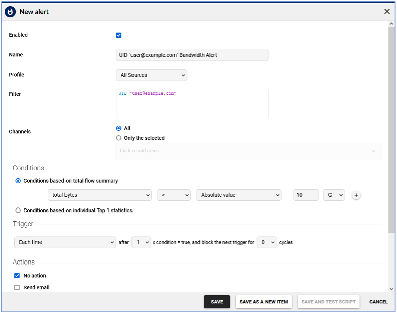 Let’s say you want to alert on a specific user identity when that user consumes more than a specific amount of bandwidth over time. You can use the same chapter we created above to create the widget to do that as well. To create such an alert, do the following: