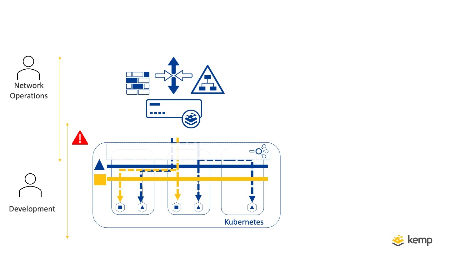 With traditional monolithic application delivery, developers are typically allocated specific endpoints on which applications are hosted and look after the building, upgrading, and release of new versions on a semi-frequent basis. Network operations teams focus on ensuring these applications can be reached. Typically dealing with the underlying network infrastructure including application delivery tasks such as Load balancing. SSL Offloading & Certificates, Access Management, and hostname or URL-based traffic routing. In this organisational structure Development and Network Operations work hand-in-hand and where changes are needed common workflows are followed (Change Requests etc). This ensures clear demarcation points between the teams.
