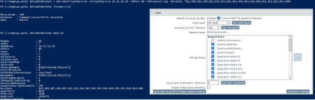 Multiple Rule Sets with multiple rules can be disabled in a single Set-AdcVirtualService command. For example, with the parameters -RuleSets “913,920” -DisabledRules “913120,913110,920160,920171”.