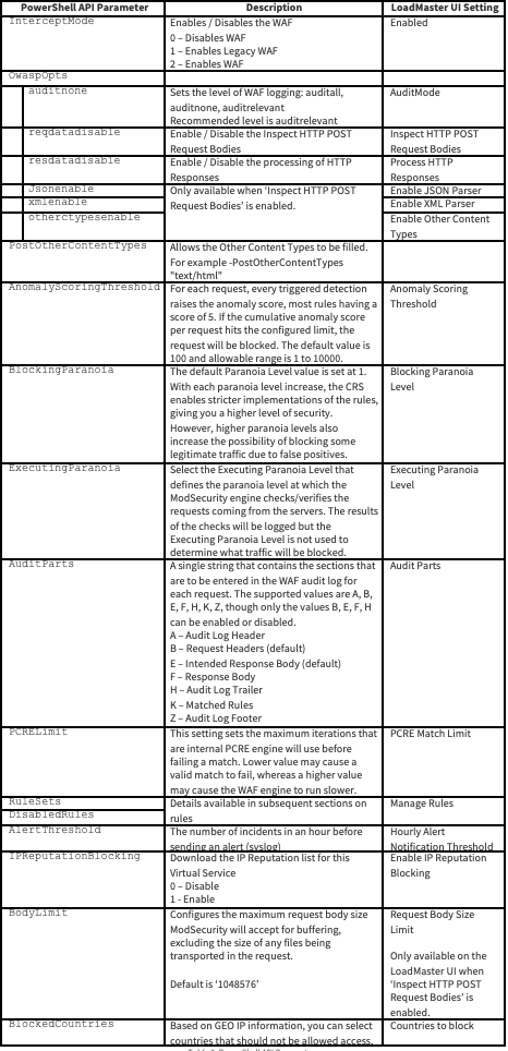 The following table outlines the specific API parameters, their description, and the corresponding entry on the LoadMaster UI. All LoadMaster UI Settings are under Virtual Services -> WAF or Virtual Services -> WAF -> Advanced Settings.