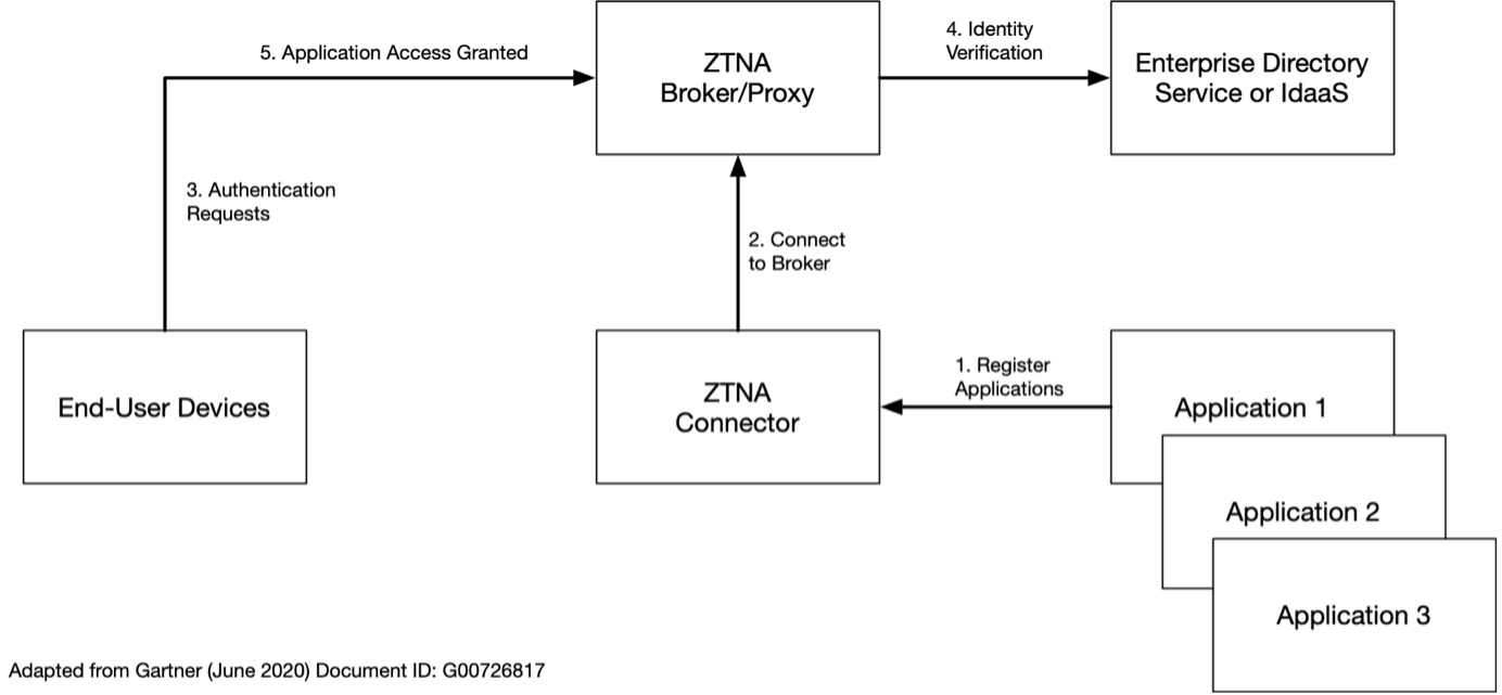that are to be provisioned creates an outbound connection with the registered applications shared ta a ZTNA Broker/Proxy. This Broker can be on a different network and is often located in a public cloud service. End-user devices send requests to the Broker,